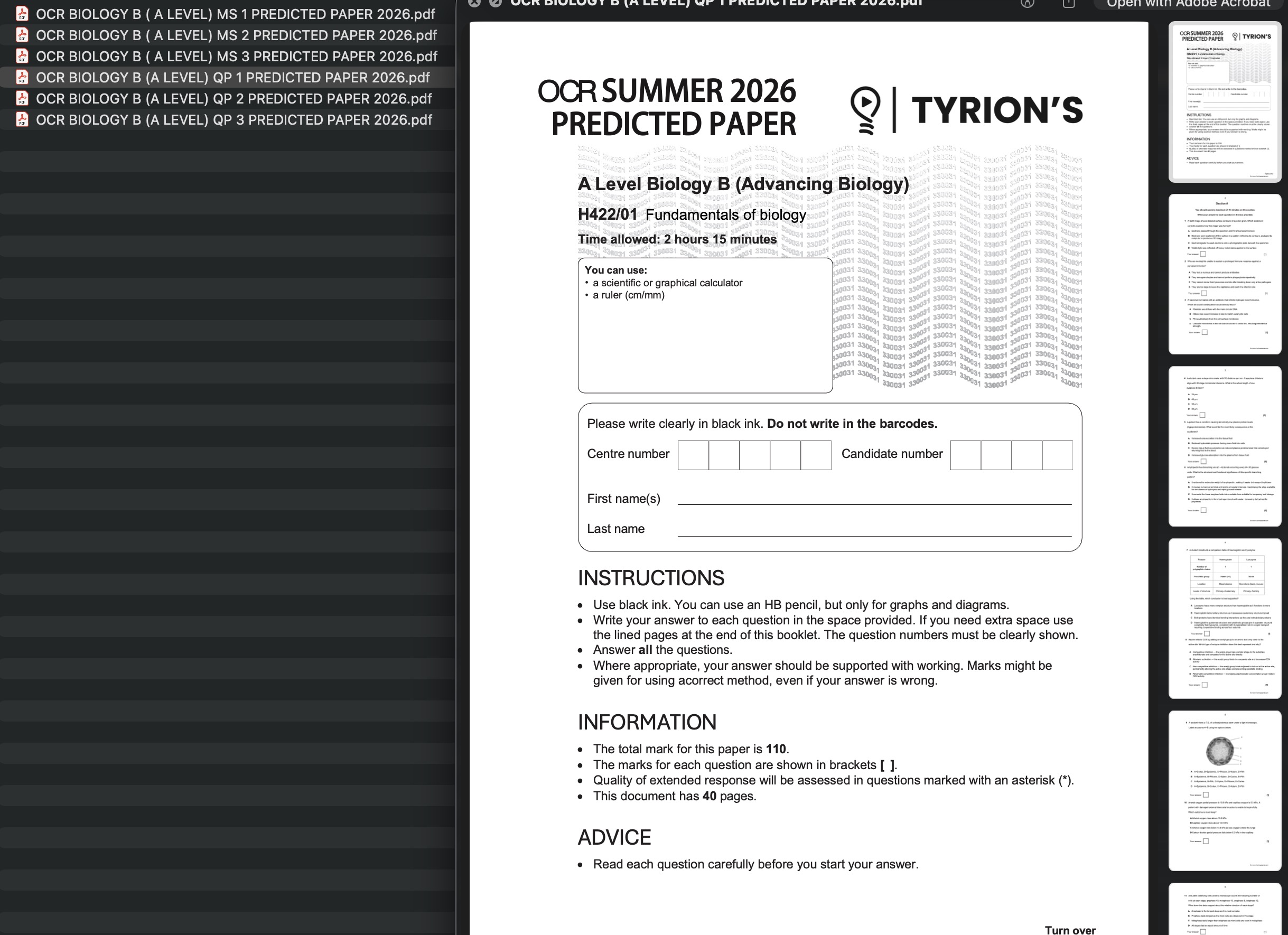 OCR A Level Biology B 2026 Predicted Papers H422