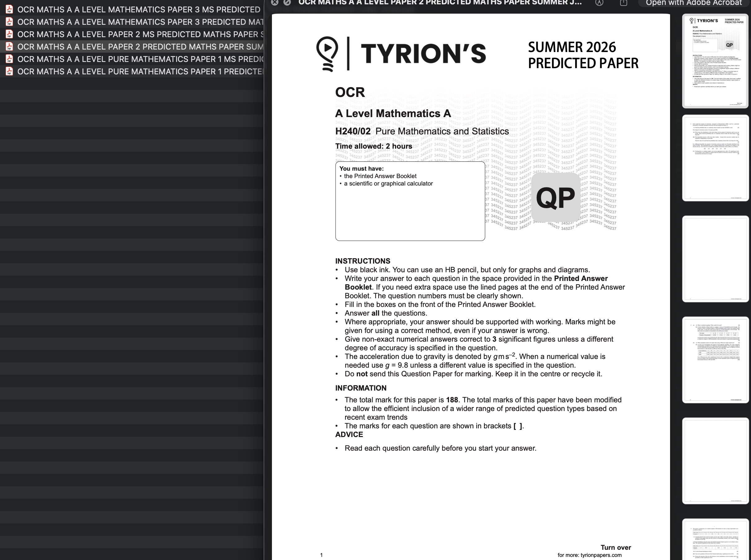 Boost your exam preparation with the OCR A Level Mathematics A 2026 Predicted Papers. Designed for students aiming for top grades, this comprehensive resource features practice questions that mirror the style and content of the upcoming exams. Each paper is carefully crafted to help you identify key topics, enhance your understanding, and build confidence. Ideal for revision sessions or self-study, these predicted papers are an invaluable tool to ensure you’re fully prepared for your  exam. Achieve your best with targeted practice and expert insights!