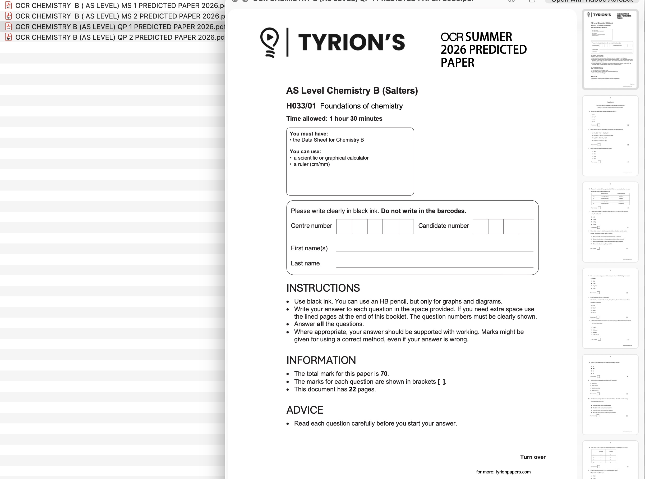 Boost your exam preparation with the OCR AS Level Chemistry B 2026 Predicted Papers H033 . Designed for students aiming for top grades, this comprehensive resource features practice questions that mirror the style and content of the upcoming exams. Each paper is carefully crafted to help you identify key topics, enhance your understanding, and build confidence. Ideal for revision sessions or self-study, these predicted papers are an invaluable tool to ensure you’re fully prepared for your  exam. Achieve your best with targeted practice and expert insights!